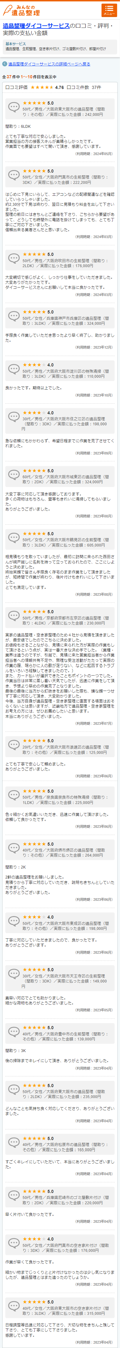 遺品整理・不用品回収・ごみ屋敷の片付けにお困りなら、株式会社ダイコーサービにお任せください。大阪市東成区を拠点に、東大阪市・大阪府全域・奈良市まで、近畿一円に幅広く対応しています。(TV大阪にてテレビCMを公開中です!)産業廃棄物の収集運搬許可を取得済みの株式会社ダイコーサービスでは、家財整理・遺品整理・不用品回収から、特殊清掃・複雑なごみ屋敷の片付け・家屋解体も、熟練のスタッフが丁寧に対応します。また、遺品整理・産業廃棄物や不用品の回収・ごみ屋敷の片付けなどに関する情報コラムもご紹介しておりますので、ぜひお役立てください。